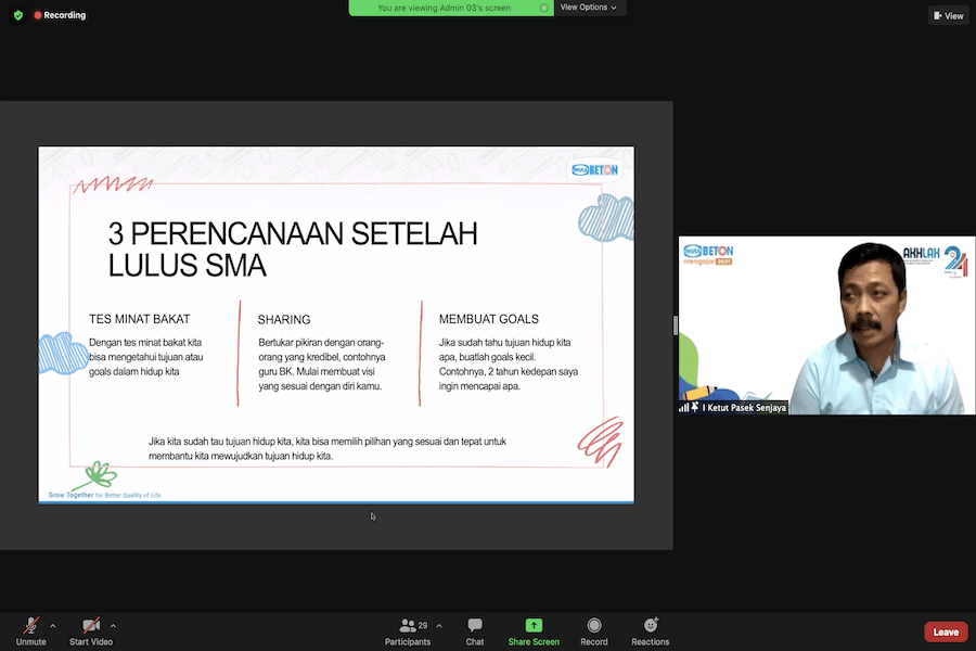 Karena kondisi pandemi yang tidak memungkinkan pertemuan tatap muka, maka WIKA Beton Mengajar tahun ini diadakan secara virtual. Terdapat 6 (enam) sekolah yang dipilih untuk berpartisipasi pada kegiatan ini, di antaranya adalah SMKN 2 Kalianda – Lampung, SMAN 1 Kelapa Nunggal – Bogor, SMK Pratama Mulya – Karawang, SMAN 1 Teras – Boyolali, SMK Yapenas – Pasuruan, dan SMA 41 – Jakarta Utara.
